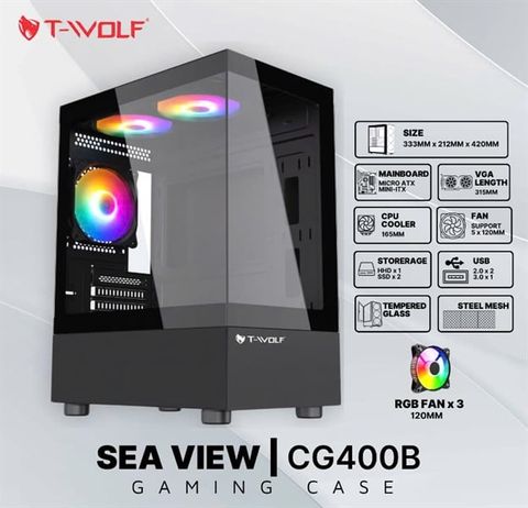 Case Gaming T-WOLF TW-CG400B + 3 Fan (Black / Tempered Glass / USB3.0*1 + USB2.0*2 + HD Audio / KT: 333 x 212 x 420mm)